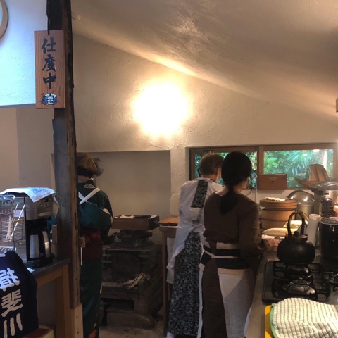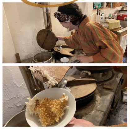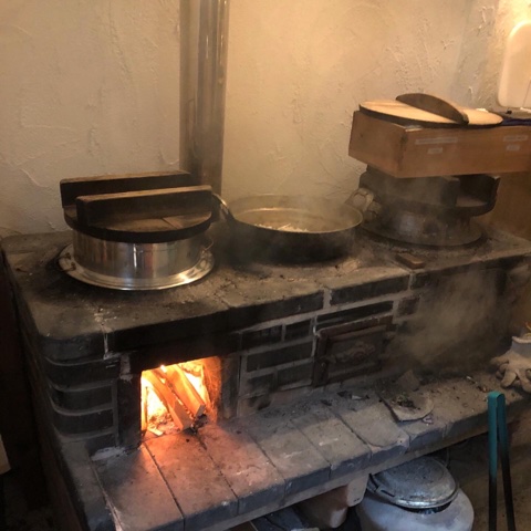 宿屋揖斐川さんにはおくどさんがあり、薪で炊いたごはんとお味噌汁の昼食を皆でお支度していただきました。